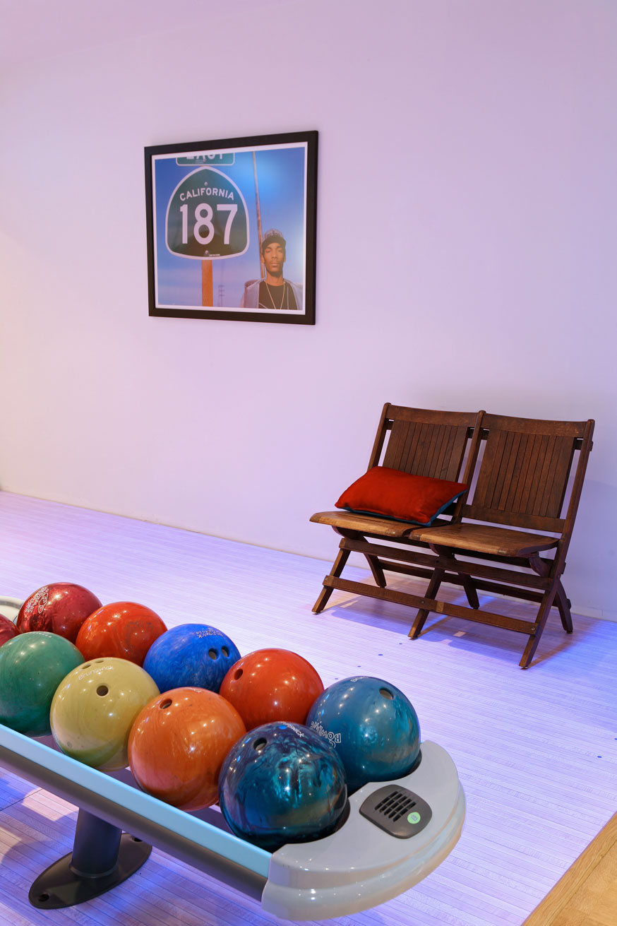 На снимках ниже изображена необычная инсталляция с игровой зоной из двух дорожек для полноценного боулинга, нескольких игровых автоматов, а также зоной отдыха для игроков с игровой приставкой и большим плазменным экраном.