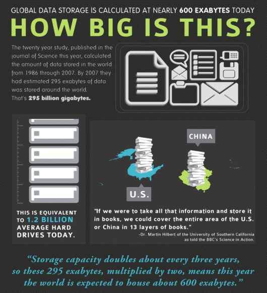 В переводе на понятные цифры, к 2007 году человечество накопило 295 миллиардов гигабайт информации. Это количество можно уместить на 1,2 миллиардах жёстких дисков объемом 250 Гб, а на каждого человека в мире приходится почти 50 Гб. Интересное сравнение приводит Мартин Хилберт из Университета Южной Калифорнии: если всю эту информации распечатать в книгах, то ими можно полностью покрыть территории США и Китая в 13 слоёв.