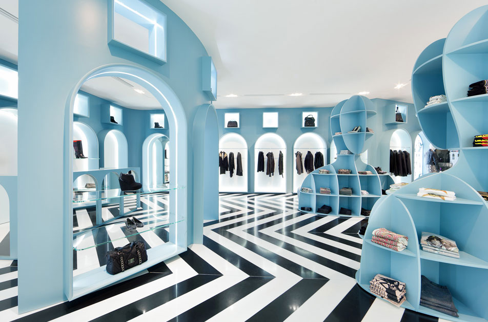Особого внимания заслуживают стеллажи из полок, образующих два огромных человеческих бюста. В светло-голубом цвете выполнены все стены, а также декоративные элементы интерьера. Черно-белый зигзагообразный рисунок на полу интересно сочетается в данном контексте и расширяет пространство.
