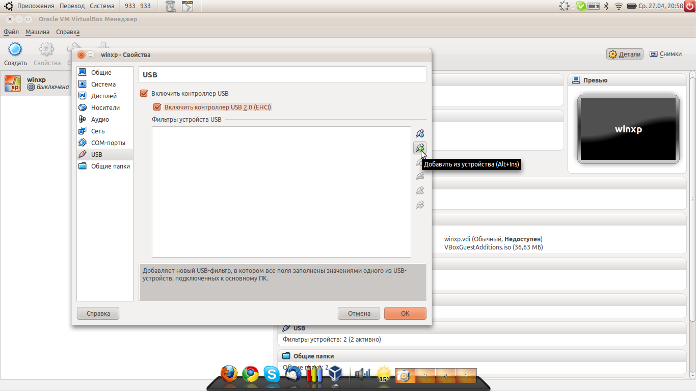 Теперь нужно настроить Virtual Box так, чтобы она пропускала подключение по USB-порту в Windows XP. Для этого заходим в свойства виртуальной машины, выбираем раздел USB и ставим галочку «Включить контроллер USB».