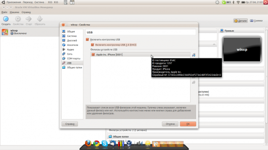Так как iPhone уже подключен к компьютеру, он отображается его в списке USB-устройств, которые можно подключить к виртуальной машине.